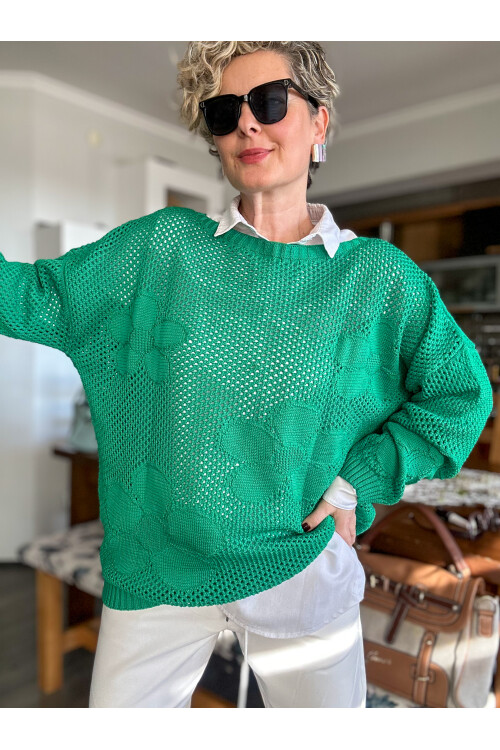 Funny Çiçek Desen Delikli Triko Bluz Yeşil
