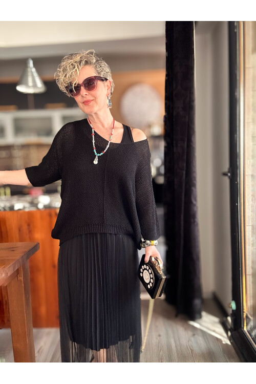 Feminen & Zahmetsiz Stil: Üst kısımdaki salaş merserize ve alt kısımdaki tül detaylı pliseli etek, günlük şıklık ile özel davet zarafetini zahmetsizce birleştirir.
