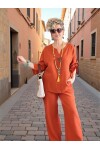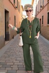 Rustik Detaylar: Bluzda bulunan doğal tahta düğmeler, takıma organik ve bohem bir hava katarak zarafetinizi tamamlar.