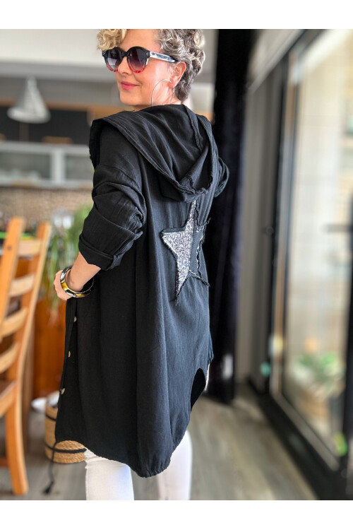 Que Tasarım Arka Star Pul Detay Kapşon Ceket Siyah