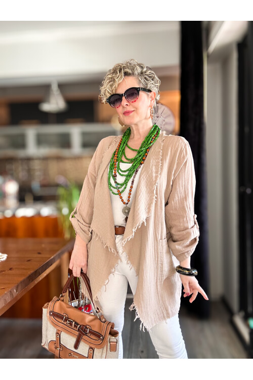 Hayalinizdeki şıklığı yakalayın! tasarım saçak püskül detaylı müslin pamuk bayan ceketi, hem zarif hem de rahat bir görünüm sunuyor. Yumuşak dokusu sayesinde gün boyu konforu hissetmenizi sağlarken, şık tasarımıyla her ortamda dikkatleri üzerinize çekecek.