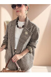 Bu özel tasarım oversize ceket, klasik dokuyu modern bir tarzla buluşturuyor. Dış yüzeyindeki zarif çizgi desen, sofistike bir görünüm kazandırırken, iç kısmındaki leopar desenli astar cesur ve zarif bir kontrast oluşturur.
