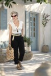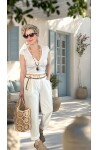 Pantolonla birlikte gelen kemer, bele şık bir vurgu yaparak tasarıma dinamik bir görünüm kazandırır.