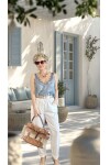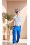 Pantolonla birlikte gelen kemer, bele şık bir vurgu yaparak tasarıma dinamik bir görünüm kazandırır.