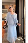 Feminen & Zahmetsiz Stil: Üst kısımdaki salaş merserize ve alt kısımdaki tül detaylı pliseli etek, günlük şıklık ile özel davet zarafetini zahmetsizce birleştirir.